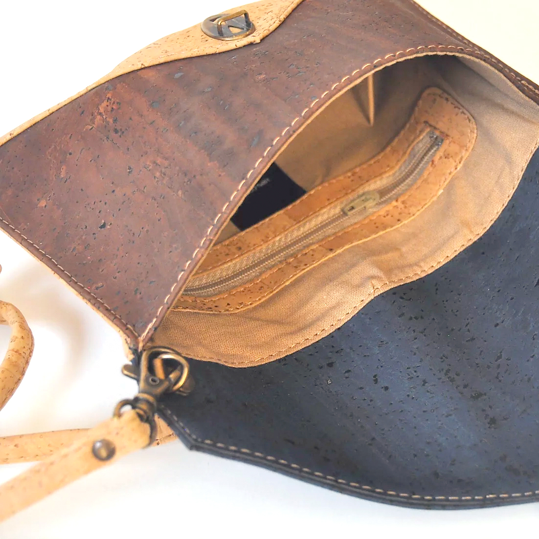 Die Korktasche Amelie gehört zu den Eleganten unter den Taschen. Sie lässt sich mit den dazugehörigen Trageriemen über der Schulter tragen oder auch einfach in der Hand mitnehmen.